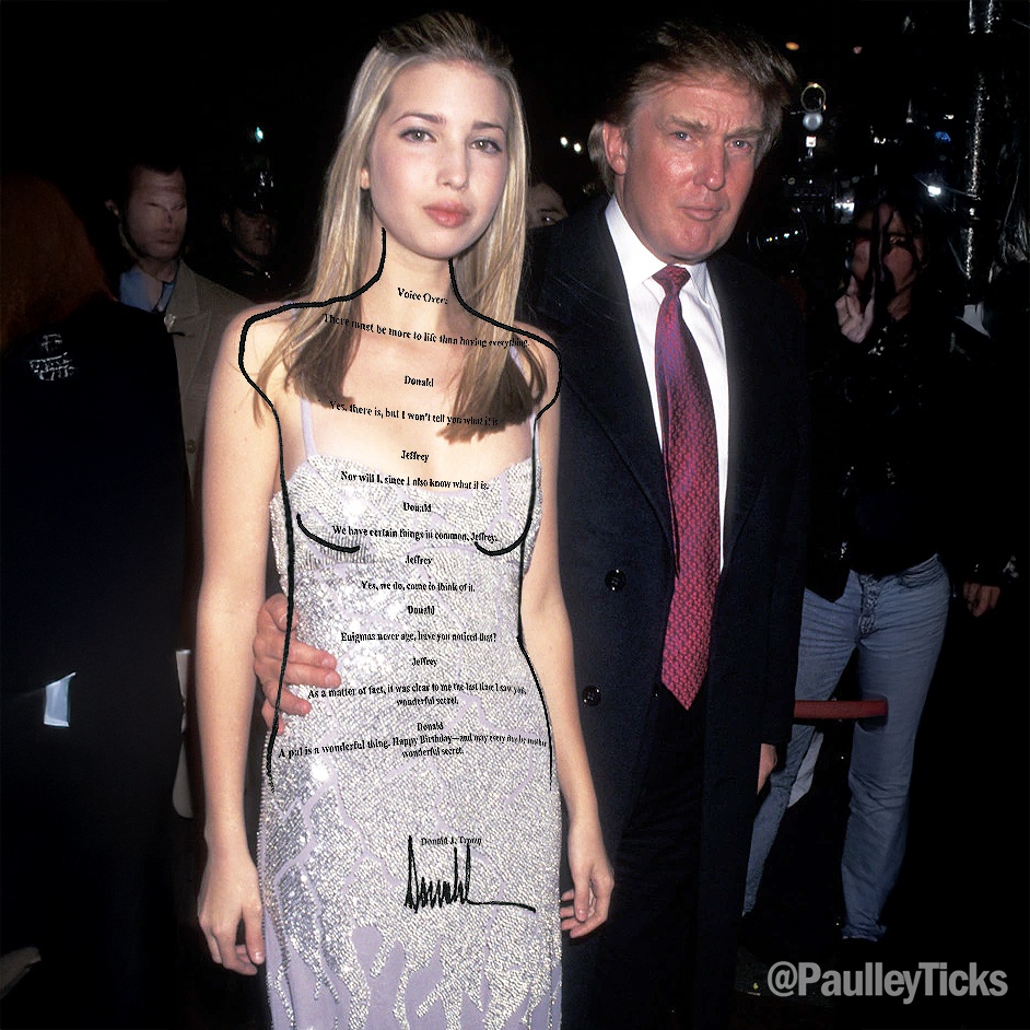 ~~~ Marie: Affections? Really? I don't think lowlifes Trump & Epstein were interested in the woman's affections. Pashcow's "joke" is indicative of Trump's and Epstein's -- and his own -- view of women as cheap slaves/commodities to be passed around and sold at devalued prices if men had bedded them or if they had grown too old. This isn't funny; it's disgusting. A Guardian story is here.