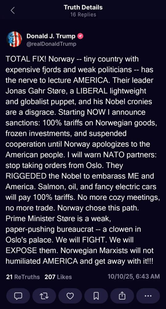 RAS posts this Trump parody post and writes, "... it was probably close to his initial reaction to the Nobel news...." Trump is such a narcissistic revenge machine, it's almost hard to believe the tweet was not from him. The parodist has captured Real Donald Trump. ~~~